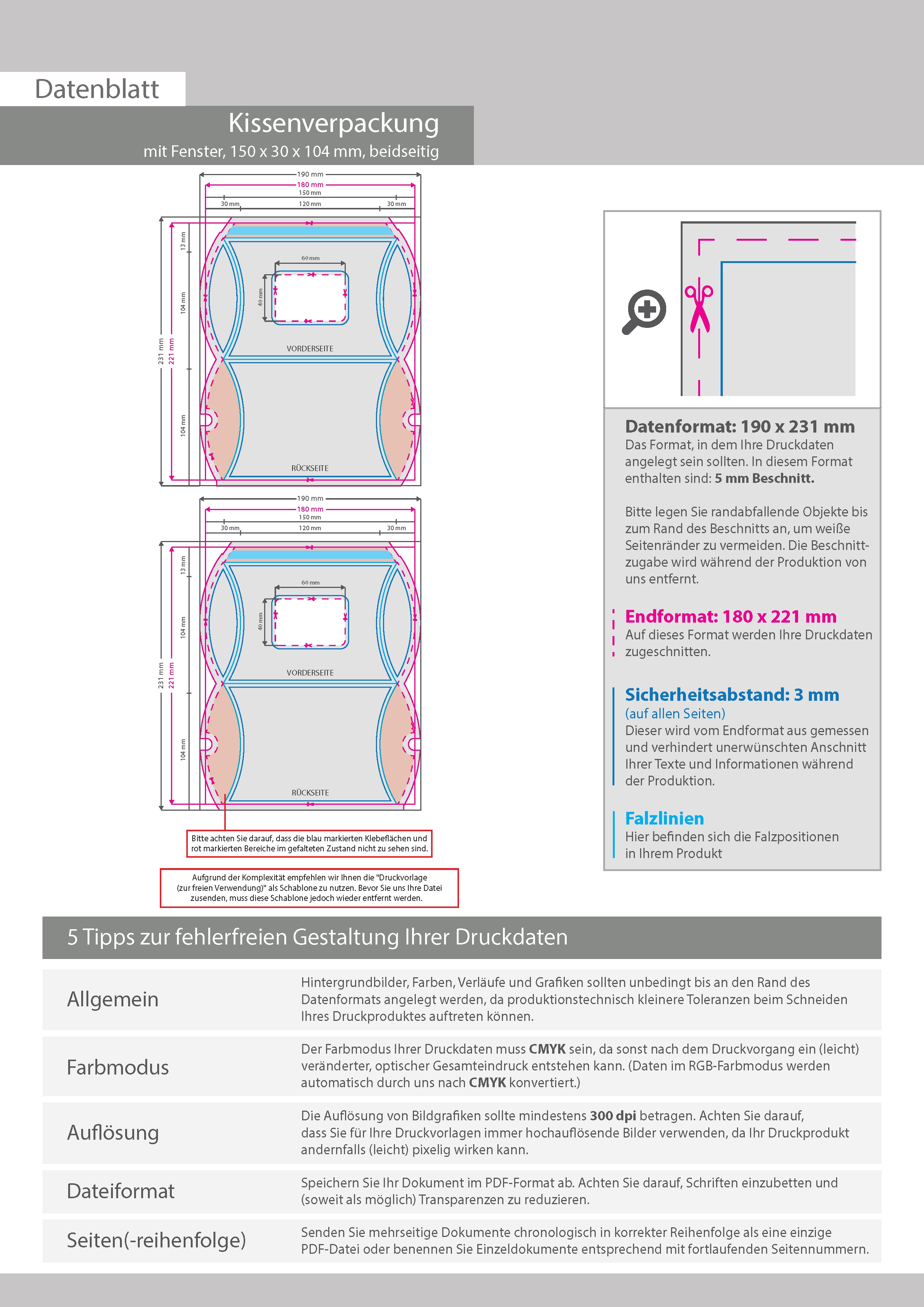 Kissenverpackung (15 cm x 3 cm x 10,4 cm) beidseitig bedruckt 5/4-farbig (CMYK + Sonderfarbe) mit gestanztem Fenster