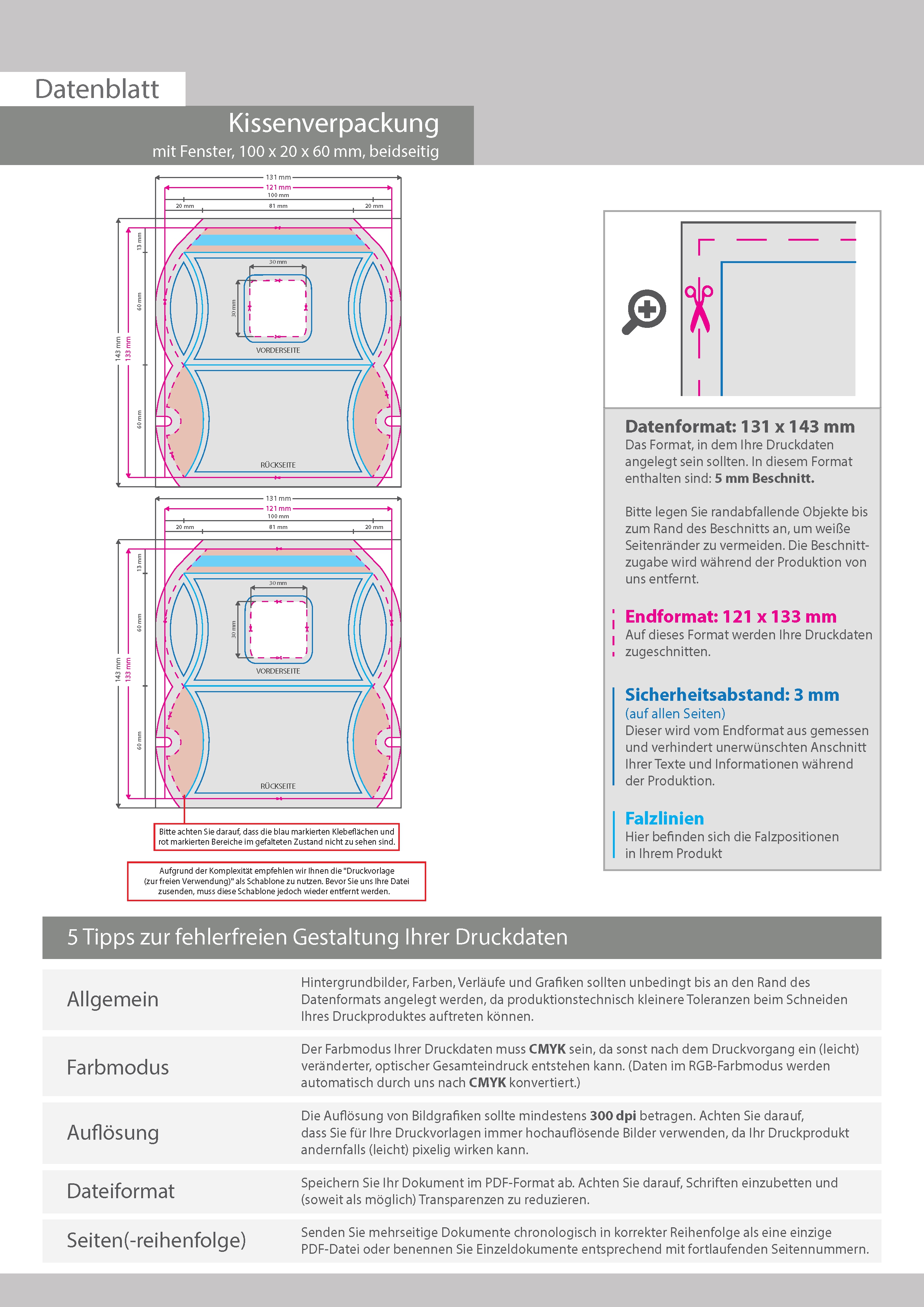 Kissenverpackung (10 cm x 2 cm x 6 cm) beidseitig bedruckt 5/4-farbig (CMYK + Sonderfarbe) mit gestanztem Fenster